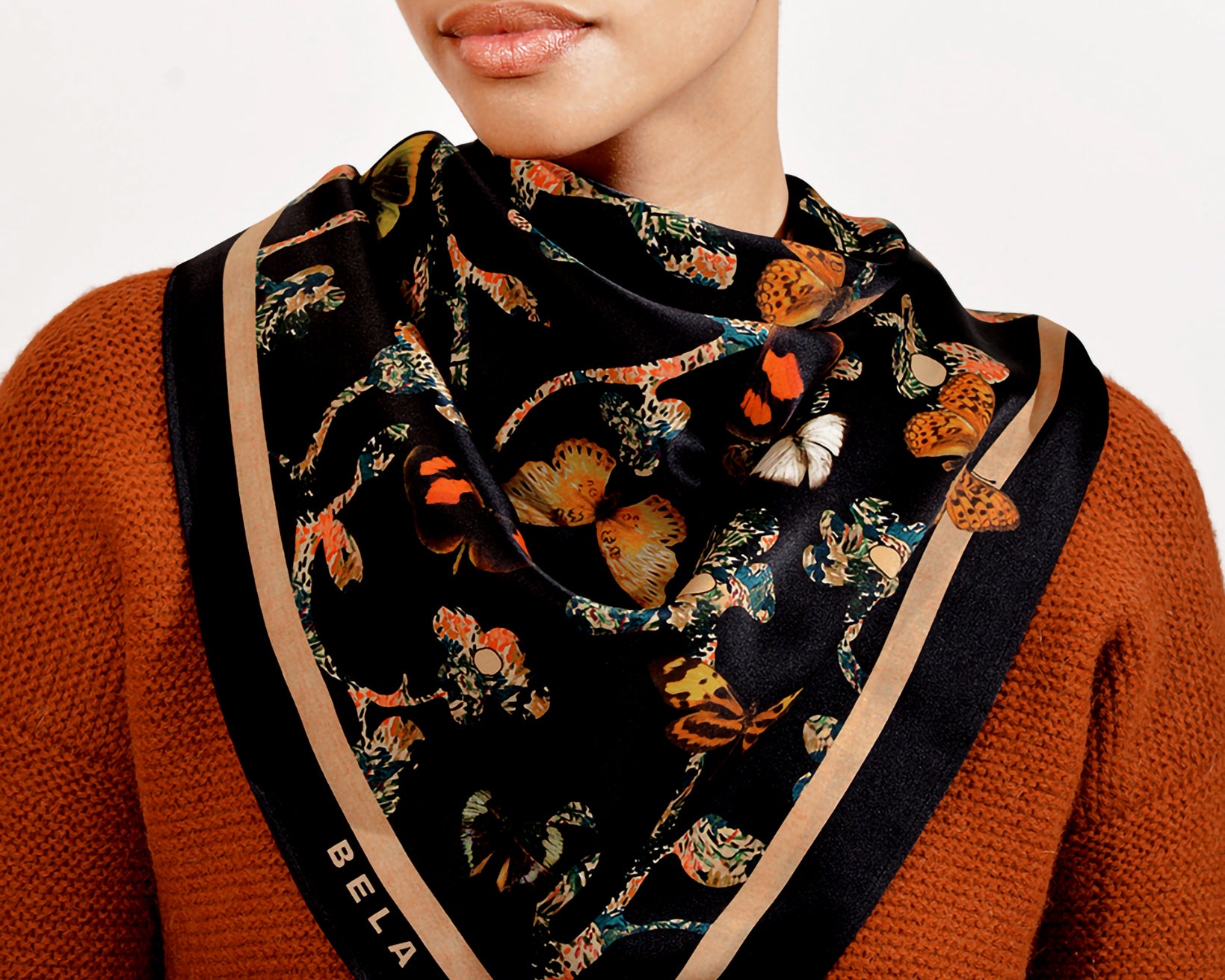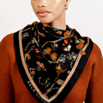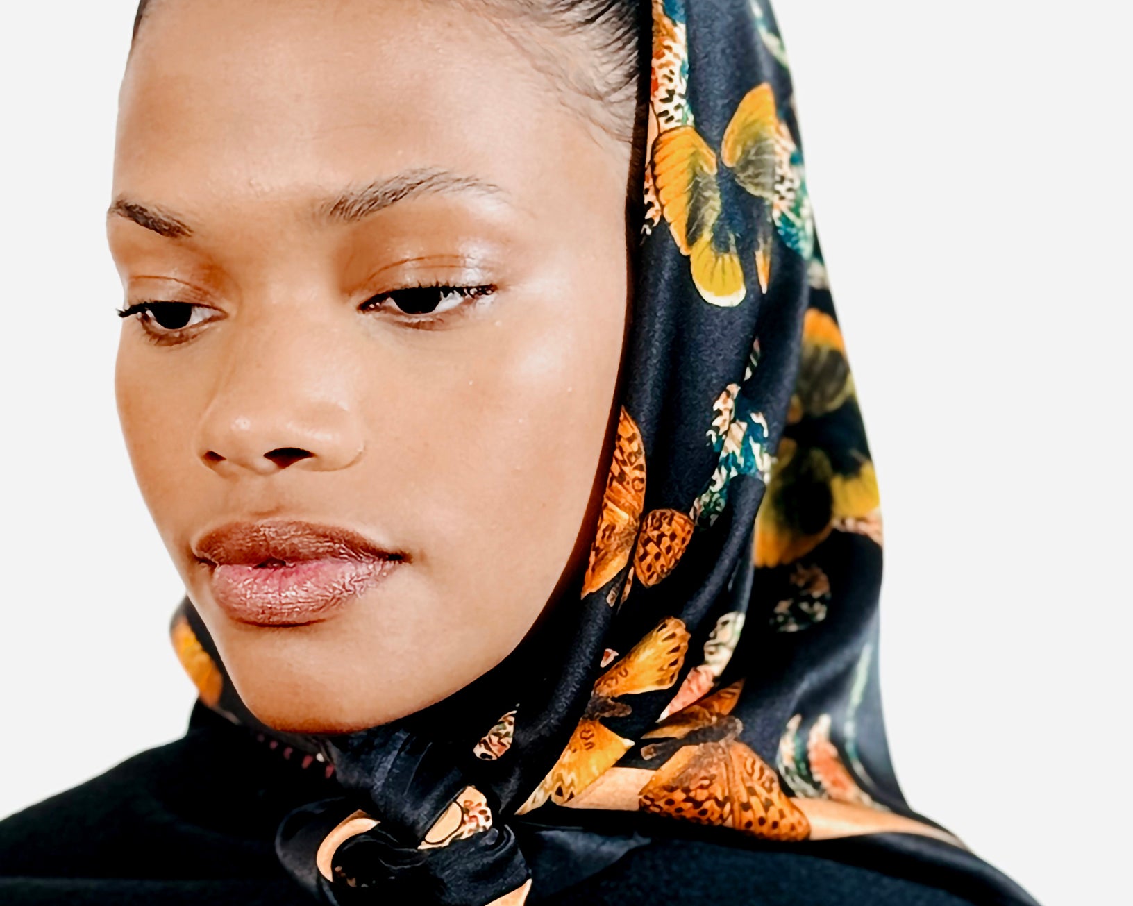 Butterflies, with their transformative journey from cocoon to flight, embody the spirit of travel and exploration. Our Black Butterfly Scarf draws its inspiration from their intricate patterns, symbolizing transformation, freedom, and elegance. Made with luxurious 100% silk charmeuse, this lightweight scarf is a versatile accessory that adds a touch of natural grace to any outfit.