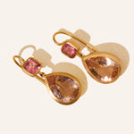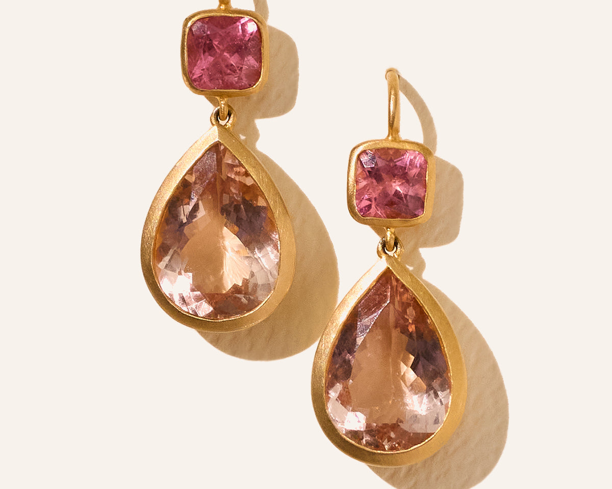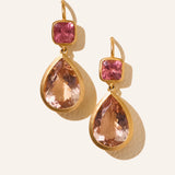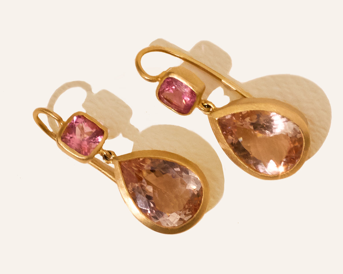 14k yellow gold cushion cut pink tourmaline earrings with pear shaped morganites.